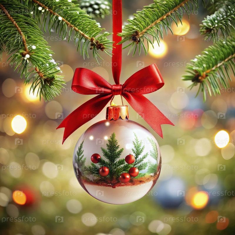 Рождественское украшение, висящее на ветке соснового дерева