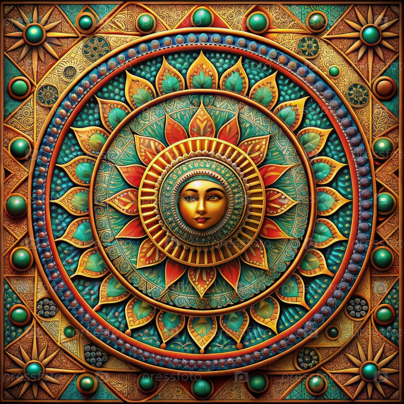 Красочный дизайн мандалы, на которой изображено солнце с женским лицом