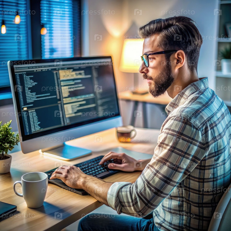 Сосредоточенный программист, работающий до поздней ночи над компьютерным кодом