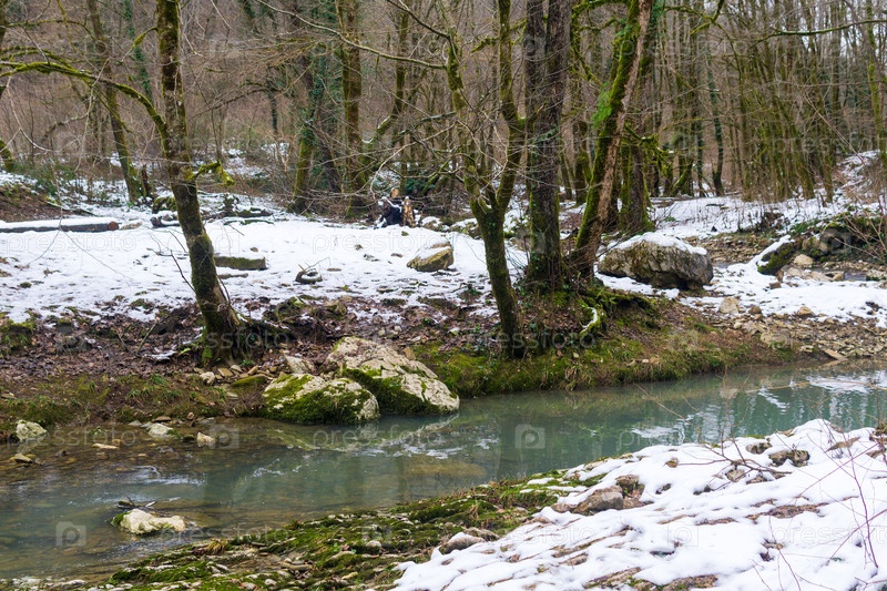 Поток в лесу, зимний пейзаж, река в лесу