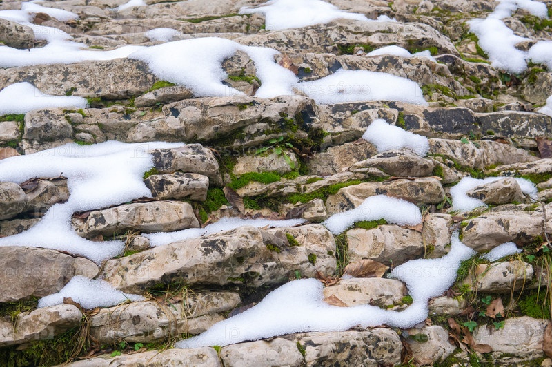 Каменная стена, покрытая снегом зимой, крупный план, фон