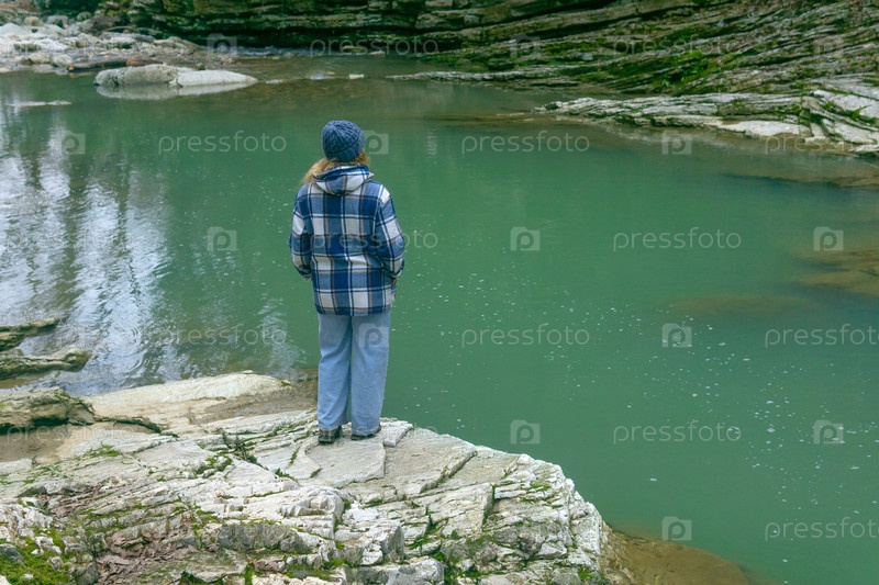 Молодая женщина в квадратном куртке стоит на скале у реки