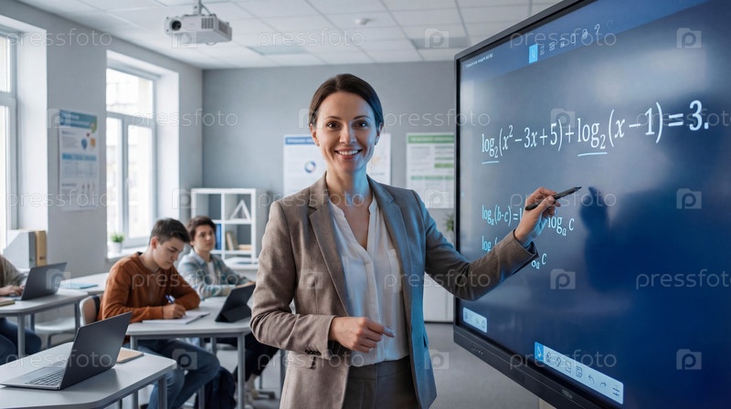 Учительница у цифровой доски объясняет материал по математике