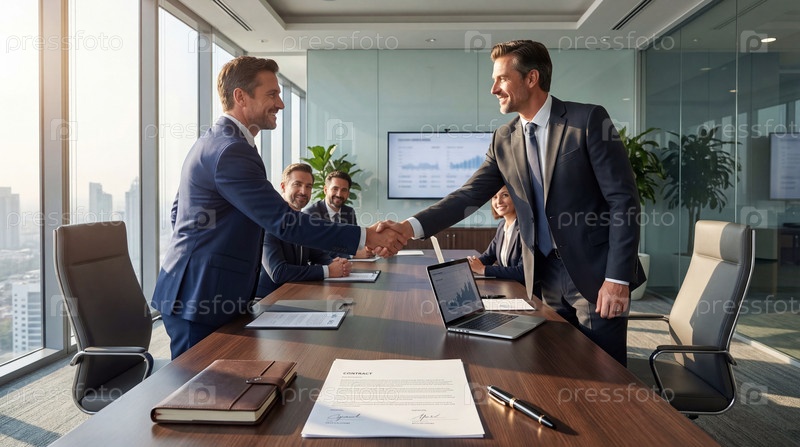 Рукопожатие деловых людей на переговорах в офисе бизнес-центра