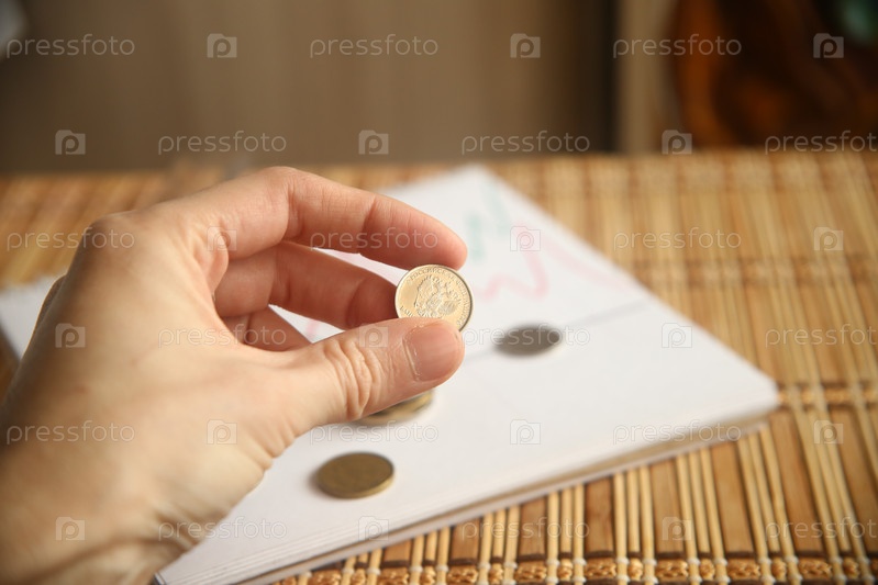 Рука с монетой рублем крупным планом. Обвал рубля и кризис