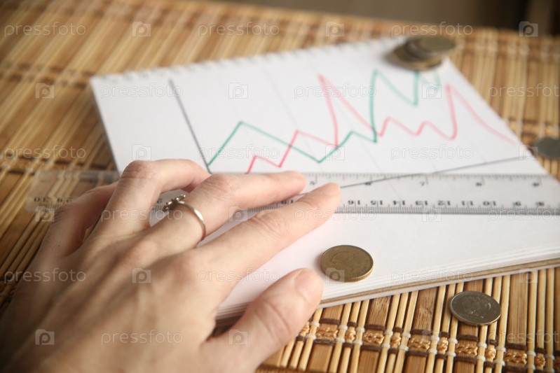 Рука с монетой и линейкой крупным планом. Обвал рубля и кризис