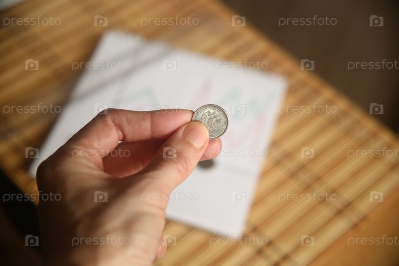 Рука с монетой рублем крупным планом. Обвал рубля и кризис