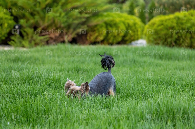 Маленькая собака с пушистой шерстью любопытно исследует пышную зеленую лужайку, окруженную ухоженными кустарниками