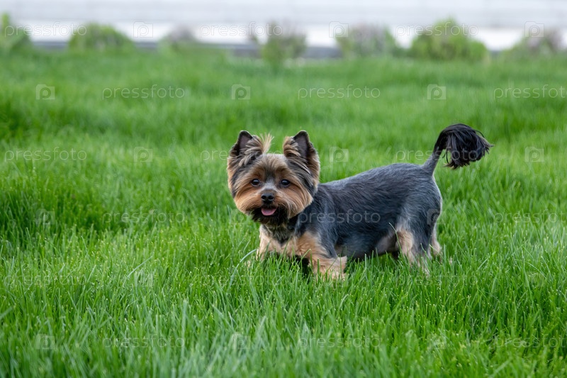 Милая собака наслаждается солнечным днем в пышной зеленой траве в местном парке во время весны