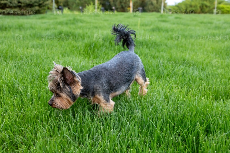 Небольшая собачка любопытно нюхает пышную зеленую траву в парке.Солнце светит, подчеркивая яркие цвета окружающей среды на открытом воздухе, а деревья видны на заднем плане