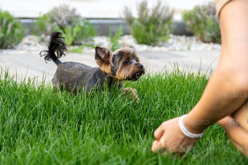 Маленькая собака любит играть на зеленой траве со своим хозяином в солнечном окружении