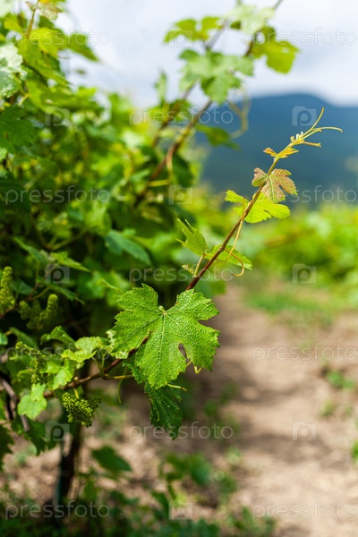 Листья винограда растут в солнечном винограднике с горами на заднем плане