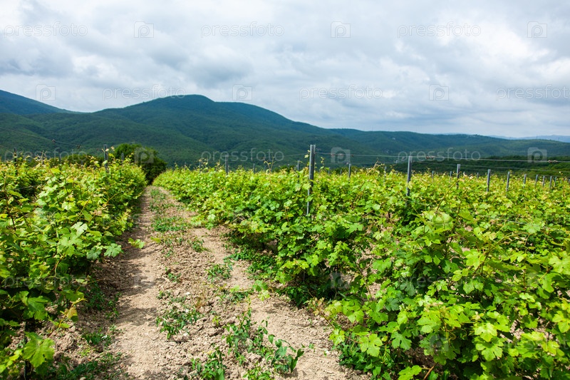 Виноградник ландшафт с зелеными лозами под облачным небом в горном регионе