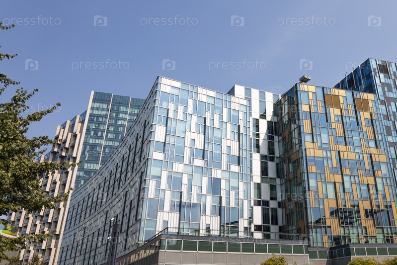 Современные офисные здания с современными стеклянными и металлическими фасадами в коммерческом районе