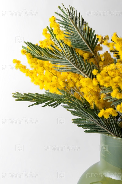 Близкий снимок свежего букета мимозы в зеленой стеклянной вазе