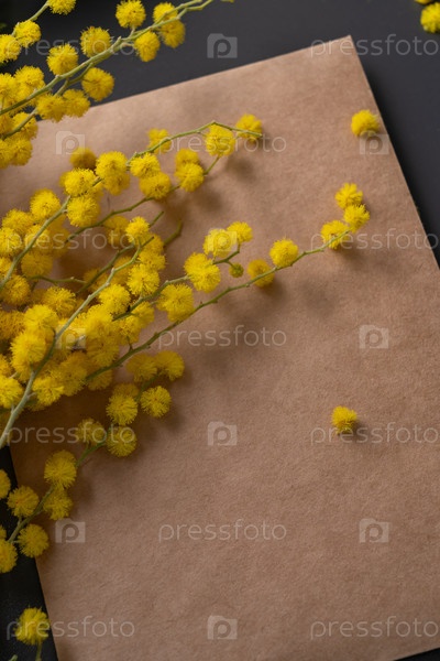 Цветы желтой мимозы на коричневом фоне бумаги
