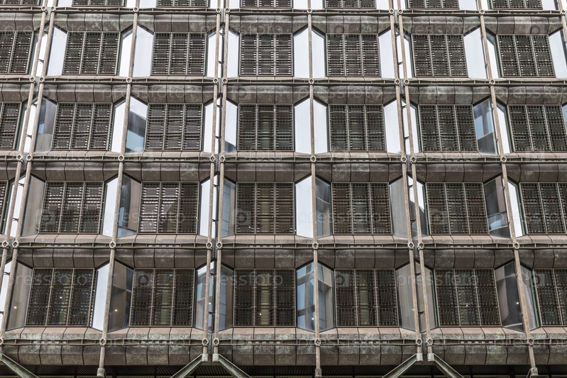 Близкий вид повторяющегося узора на фасаде современного бруталистского бетонного здания