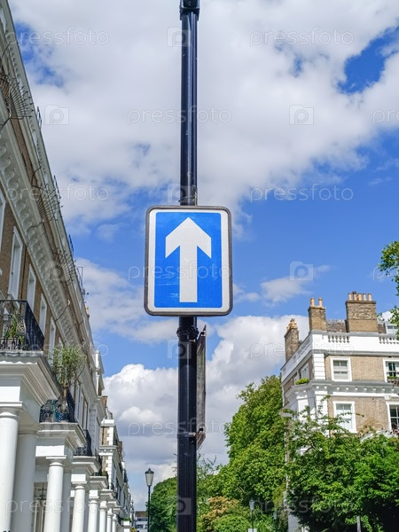 Синий односторонний дорожный знак, прикрепленный к черному столбу на солнечной жилой улице в Лондоне с традиционной архитектурой