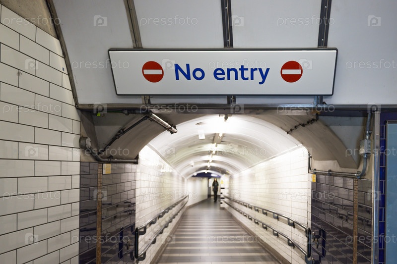 Знак запрета на въезд висит над пустым пешеходным туннелем в станции метро