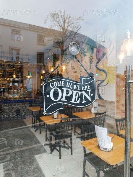 Ближайшее изображение открытого знака на стеклянной двери кафе-ресторана, показывающего чистую и приятную столовую с деревянными мебелью