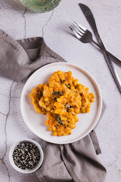 Золотые хрустящие кукурузные фритры на тарелке на столе и вертикальный вид