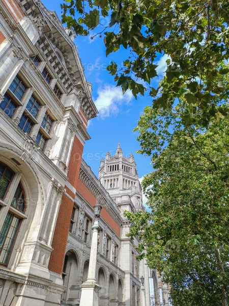 Архитектурная деталь исторического здания в Лондоне с сложной каменной работой и каменной башней, обрамленной зелеными ветвями деревьев на голубом небе