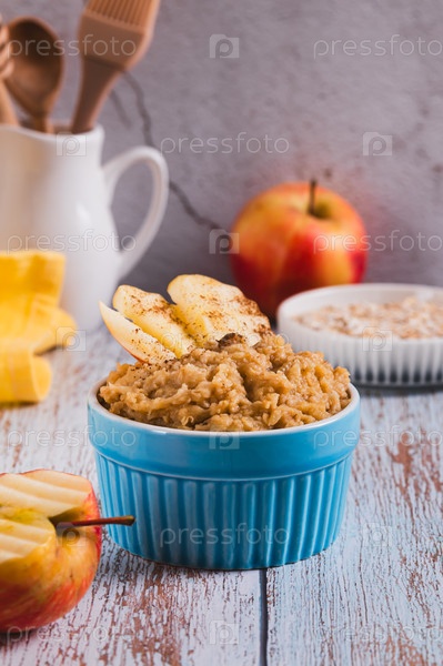 Вегетарианская яблочная овсяная каша, испеченная в микроволновой печи в миске на столе вертикальный вид