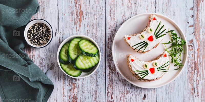 Сэндвичи с колбасой, украшенные овощами на тарелке на столе верхний вид веб-баннер
