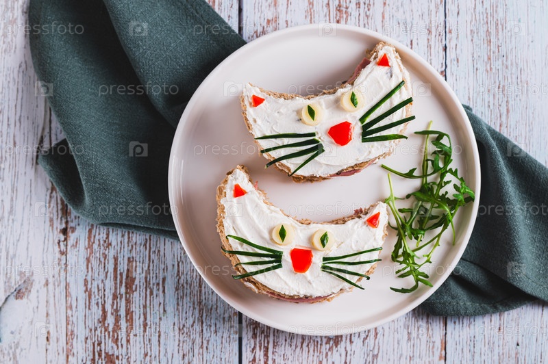 Близкий снимок кошачьих бутербродов из колбасы, рикоты и зернового хлеба на тарелке сверху стола