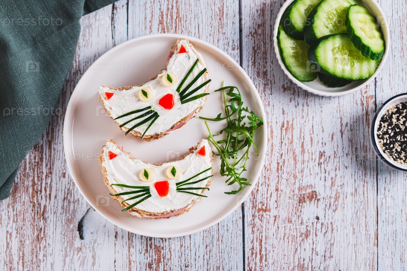 Котские бутерброды из колбасы, рикоты и цельнозернового хлеба на тарелке на столе