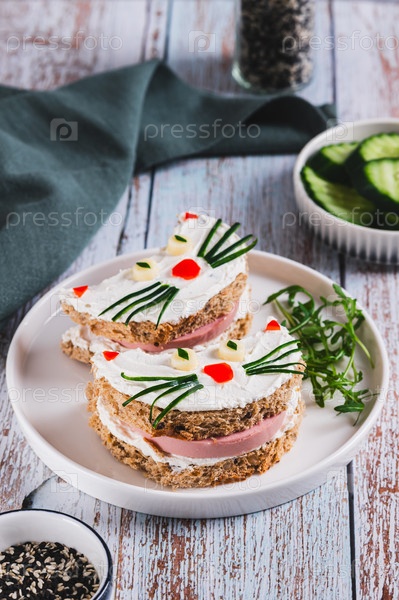 Котские бутерброды из колбасы, рикоты и цельнозернового хлеба на тарелке на столе вертикальный вид