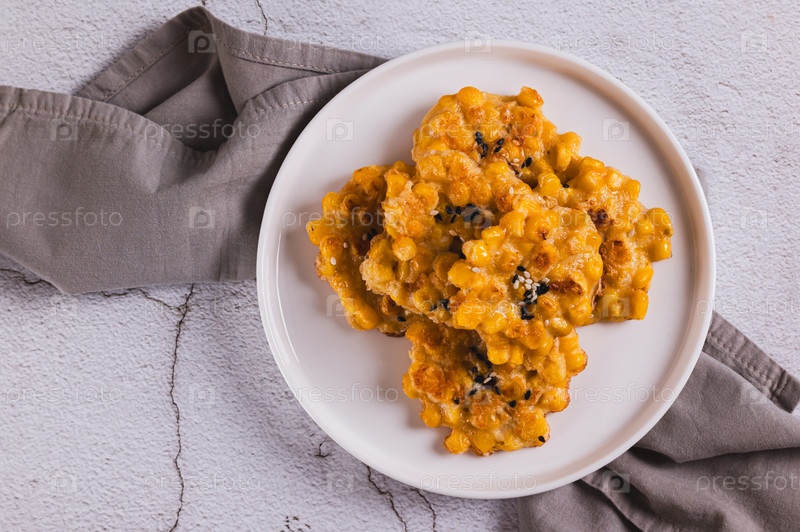 Близкий снимок вкусных кукурузных фритер с травами на тарелке на столе