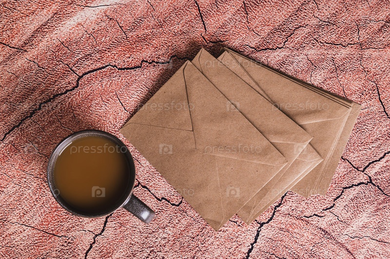 Чашка кофе и конверты для написания бумажных писем на столе
