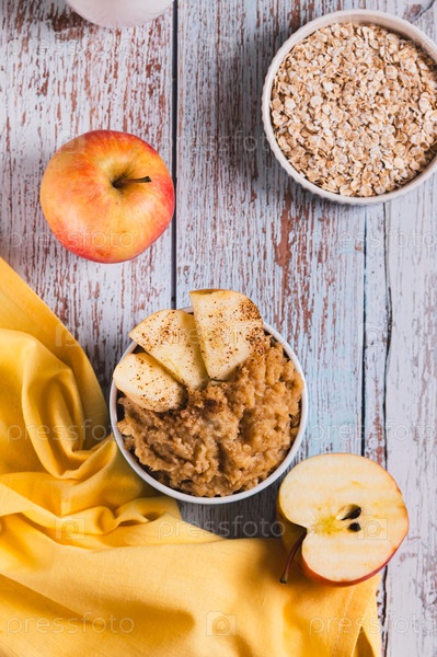 Овсянка с яблоком, запеченная в миске на столе и вертикальный вид