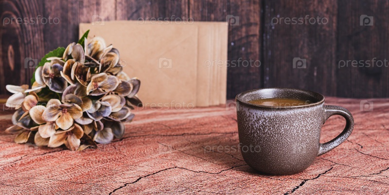 Чашка кофе, цветы и мебельные конверты для написания бумажных писем на столе