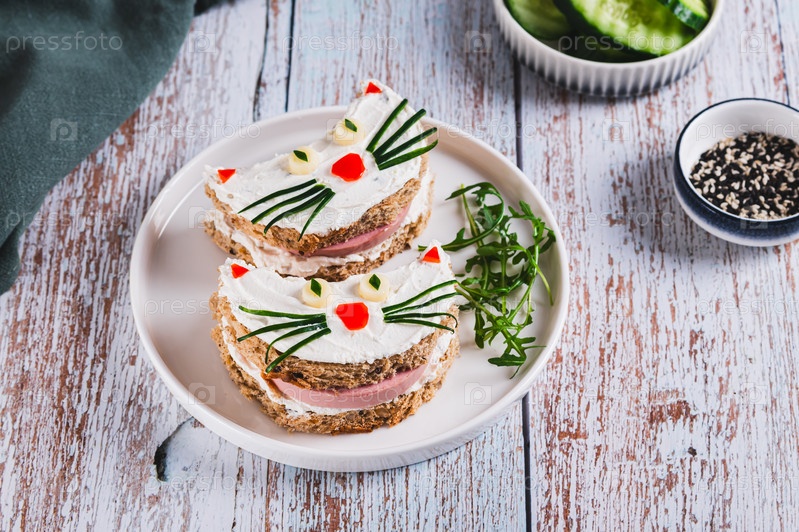 Сэндвичи с колбасой, украшенными овощами на тарелке на столе