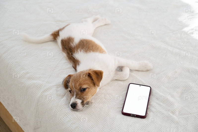 Щенок Джек Расселл Терьер собака лежит на кровати со смартфоном