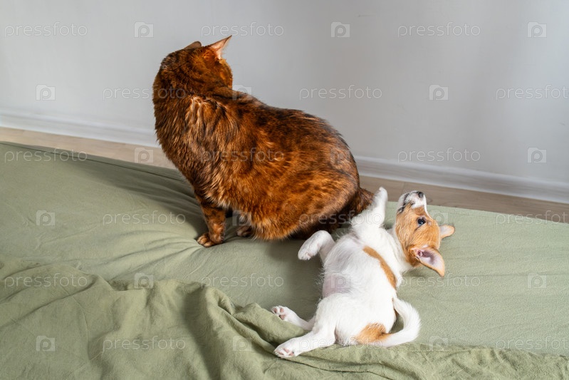 Имбирный кот и щенка играют на кровати. Концепция дружбы домашних животных