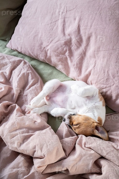 Милый щенк Джека Расселла спит вверх ногами на кровати