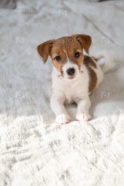 Маленький милый чистокровный щеночек с коричнево-белым мехом лежит на белом одеяле или постельном покрытии