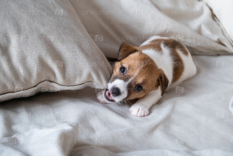 Милый щенок, жующий подушку.Очаровательная маленькая ткань для кусания собаки
