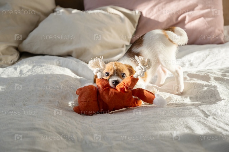 Счастливый щенк, играющий с игрушкой для жевания на кровати