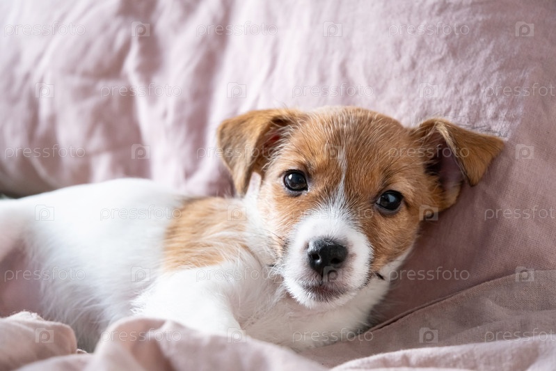 Милый щенок, отдыхающий на мягком одеяле