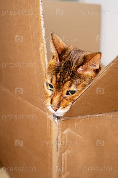 Бенгальская кошка выглядит из картонной коробки