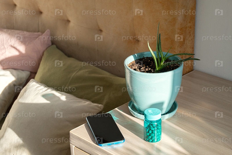 Смартфон, горшочное растение и бутылка таблеток на ночном столе рядом с кроватью