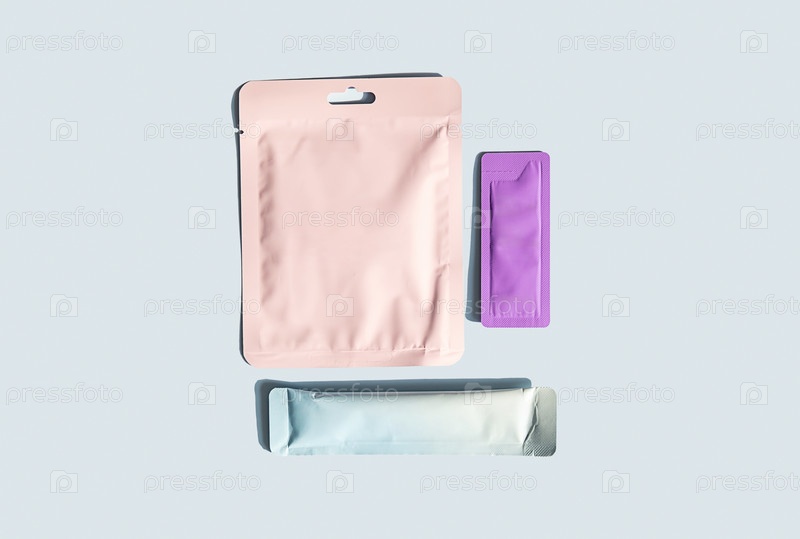 Набор пустых косметических пакетов на светлом фоне.Мокет маски для лица и упаковки образцов