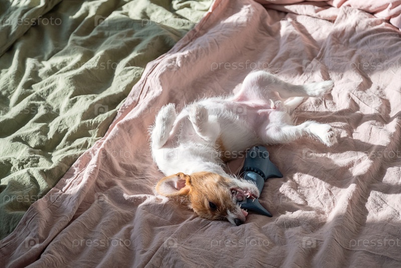 Щенок играет с игрушечной акулой, лежа на спине в постели