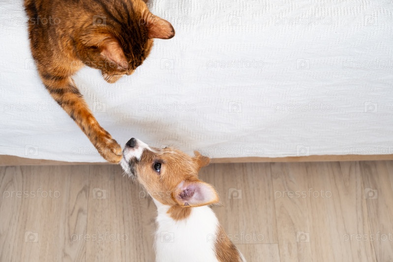 Кошачий лапа касается носа щенка с любопытным взаимодействием
