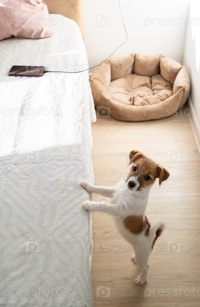 Молодая собака стоит у белой кровати в комнате дома