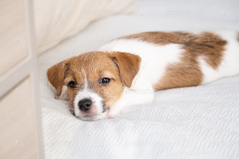 Щенок с коричневой и белой шерстью лежит на легком одеяле